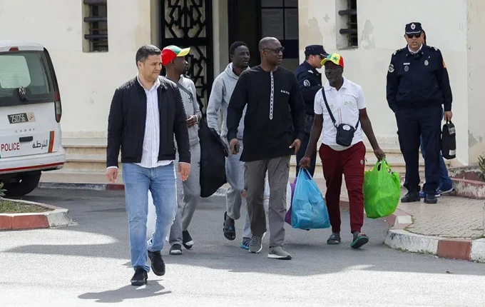 Senegal football supporters walk with their personal belongings after being released from Al Arjat 2 prison in Sale on April 18, 2026. Three Senegalese supporters were released on April 18 from a Moroccan prison after serving a three-month custodial sentence for having taken part in the violence that broke out during the AFCON final in Rabat, an AFP journalist observed.
