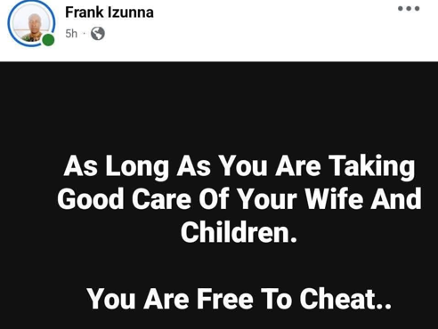 A Nigerian businessman, Frank Izunna, has said that men are free to cheat as long as they are not neglecting their wives and children.