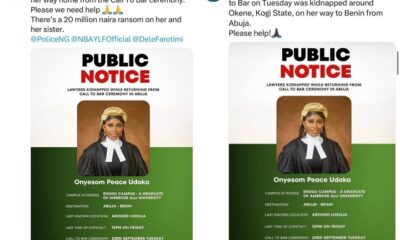 Friends raise alarm over lawyer who was ‘k!dnapped’ while travelling to Benin after attending her Call to Bar ceremony in Abuja Friends of a Nigerian lady,...
