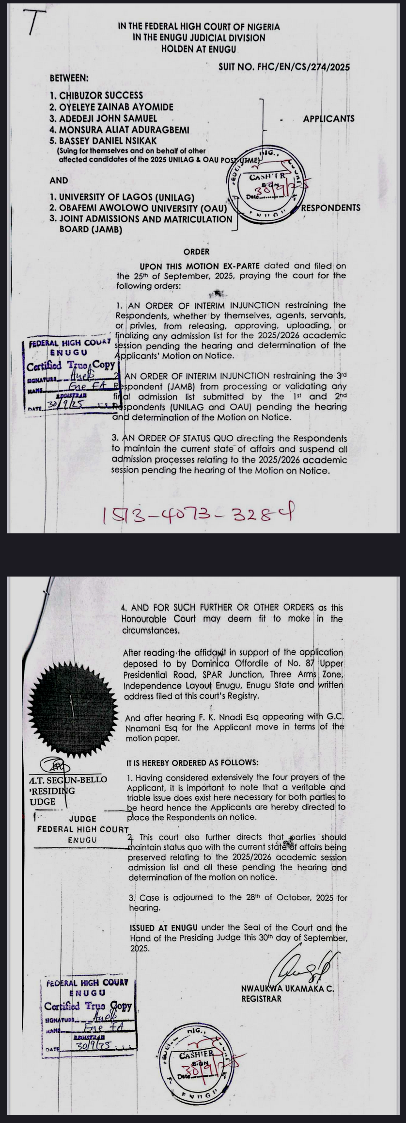 A Federal High Court sitting in Enugu has ordered the immediate suspension of the 2025/2026 admission process at the University of Lagos (UNILAG) and Obafemi Awolowo University (OAU).