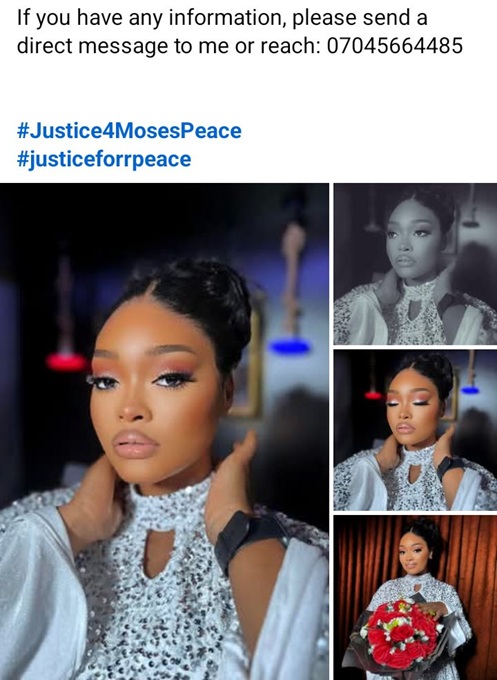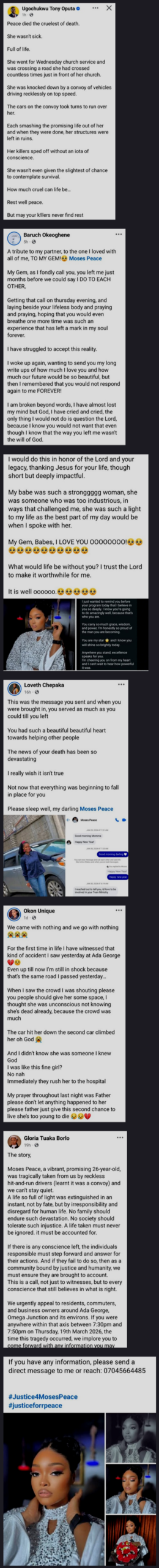 “Moses Peace, a vibrant, promising 26-year-old, was tragically taken from us by reckless hit-and-run drivers (learnt it was a convoy) and we can’t stay quiet,” a lawyer and friend, Gloria Borlo, wrote.